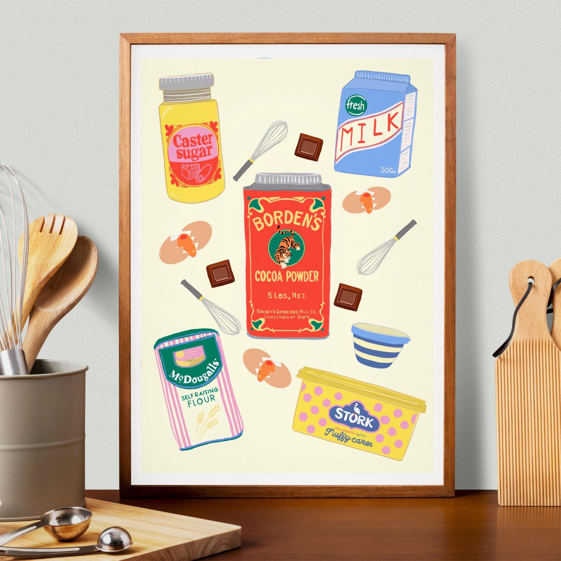 Baking ingredients kitchen Print/Poster, Featuring - Margarine, vintage Cocoa tin, Flour, Eggs, Whisk, Retro Sugar Canister, Chocolate
