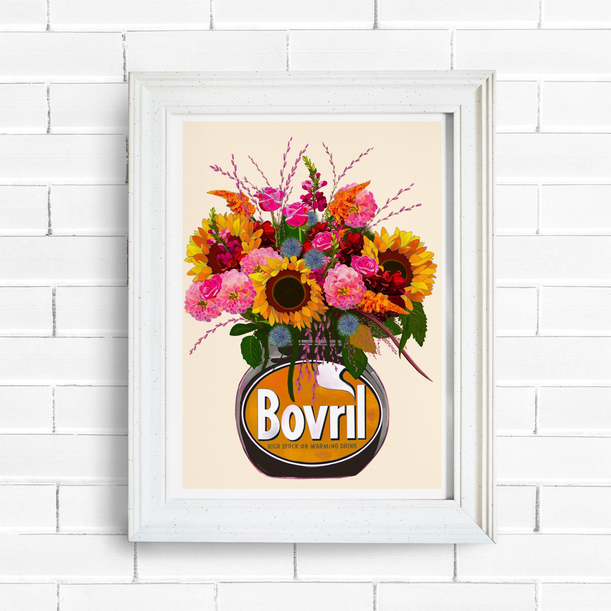 Chicken Bovril with pink roses, Yellow Sunflowers & Red and Pink Dahlias Poster/Art Print - Unframed, A5 A4 A3 - Kitchen My Bovril Illustration has been printed on premium, heavy weight, matte paper using top quality inks to provide a vibrant and beautiful piece of art for any room of your home.