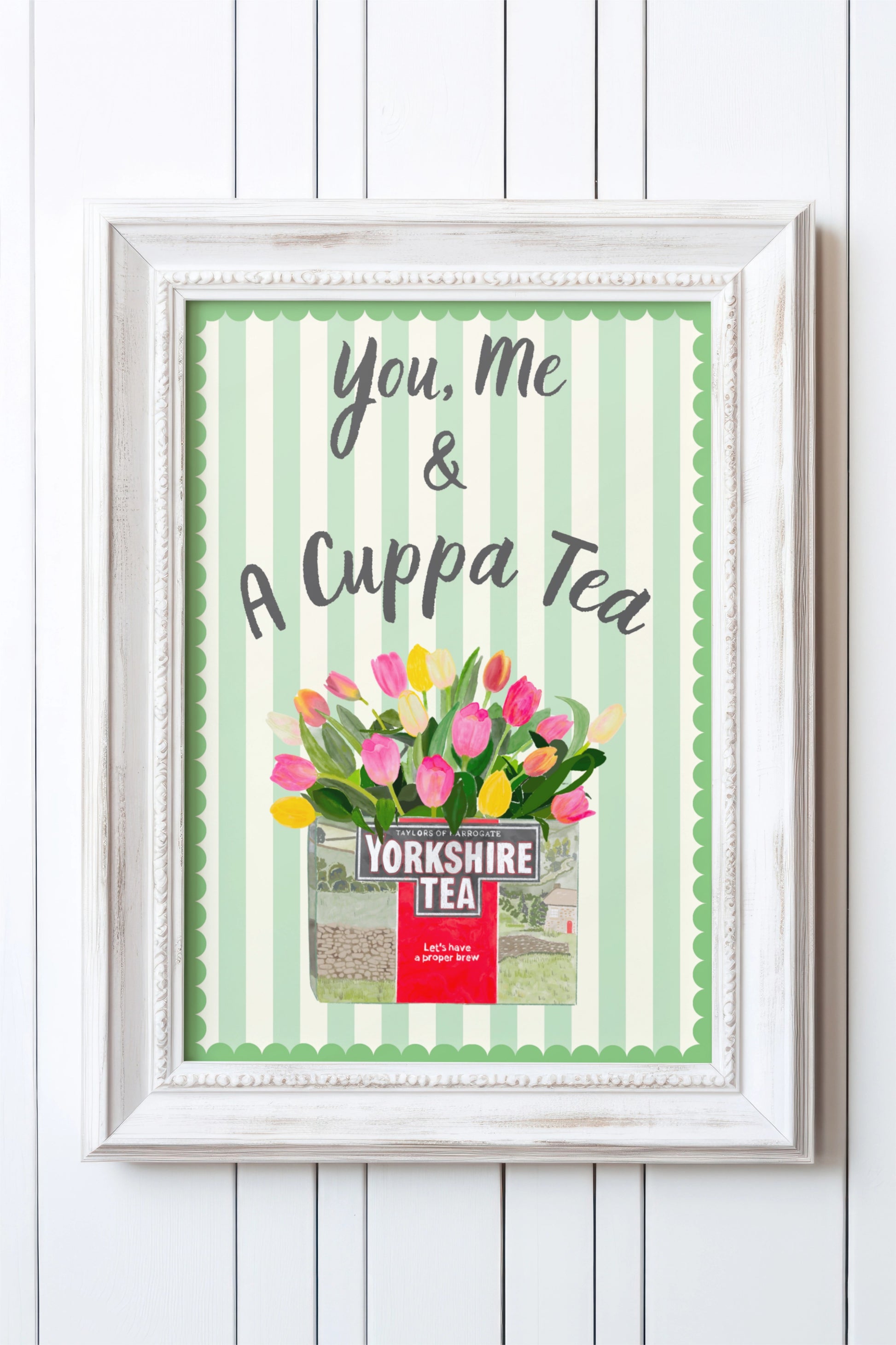 Yorkshire Tea with Tulips Art print, kitchen poster, sage green striped background with scalloped border. "You, Me & a Cuppa Tea"